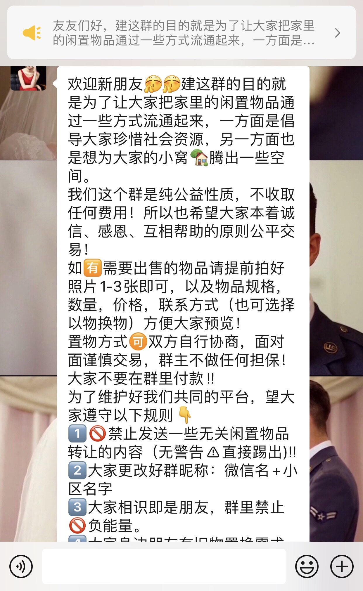 活动发起人诗语介绍,这是一个纯公益的微信群,为大家提供置换闲置物品的平台。诗语称,自家平时存储的东西非常多,放在家里用不到,扔了又可惜,送人又担心别人会介意,所以就想着建一个“小区闲置物品转让群”。“物品置换主要是居民双方私下进行协商,也可在群主的帮助下,通过建三人群的方式辅助双方进行交易。”诗语介绍,加入微信群的居民如有需要转让的物品,需提前拍好1至3张照片,并注明物品规格、数量、价格、联系方式等信息。