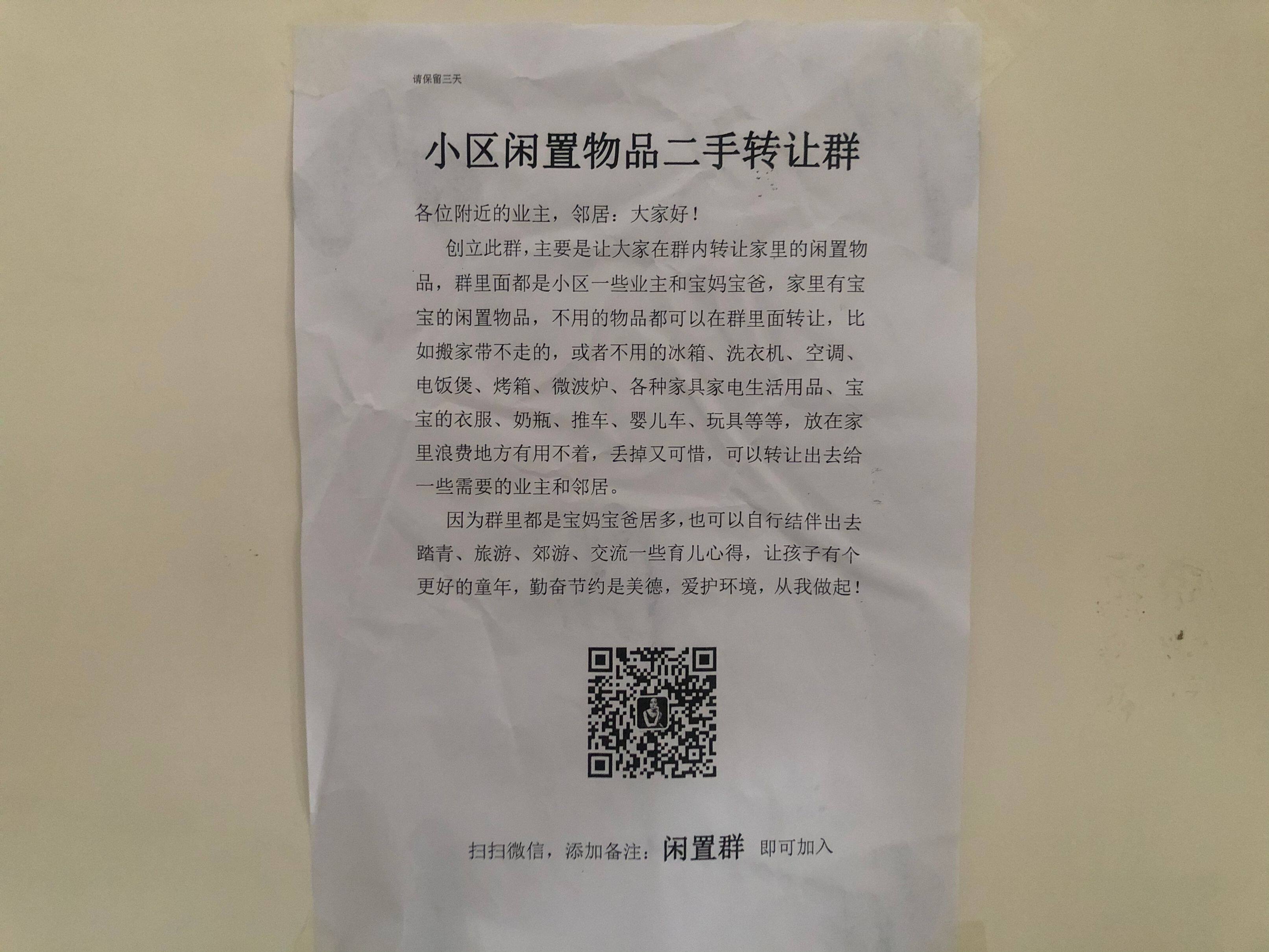 最近,在顺庆的一些小区,有不少居民发现楼道里张贴着写有“小区闲置物品转让群”的广告,并附有微信二维码。广告内容介绍,“小区闲置物品转让群”是为了方便业主邻居把自家不用的物品转让给那些有需要的业主而建立的一个微信群。