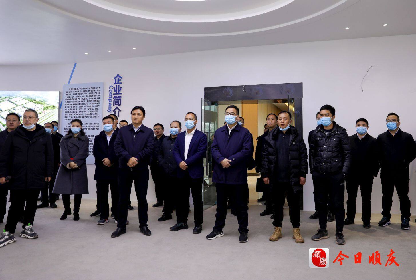 图 区委书记蒲鹏程(前排右三)、区长唐粼波(前排右四)督导南充凯普松建设。