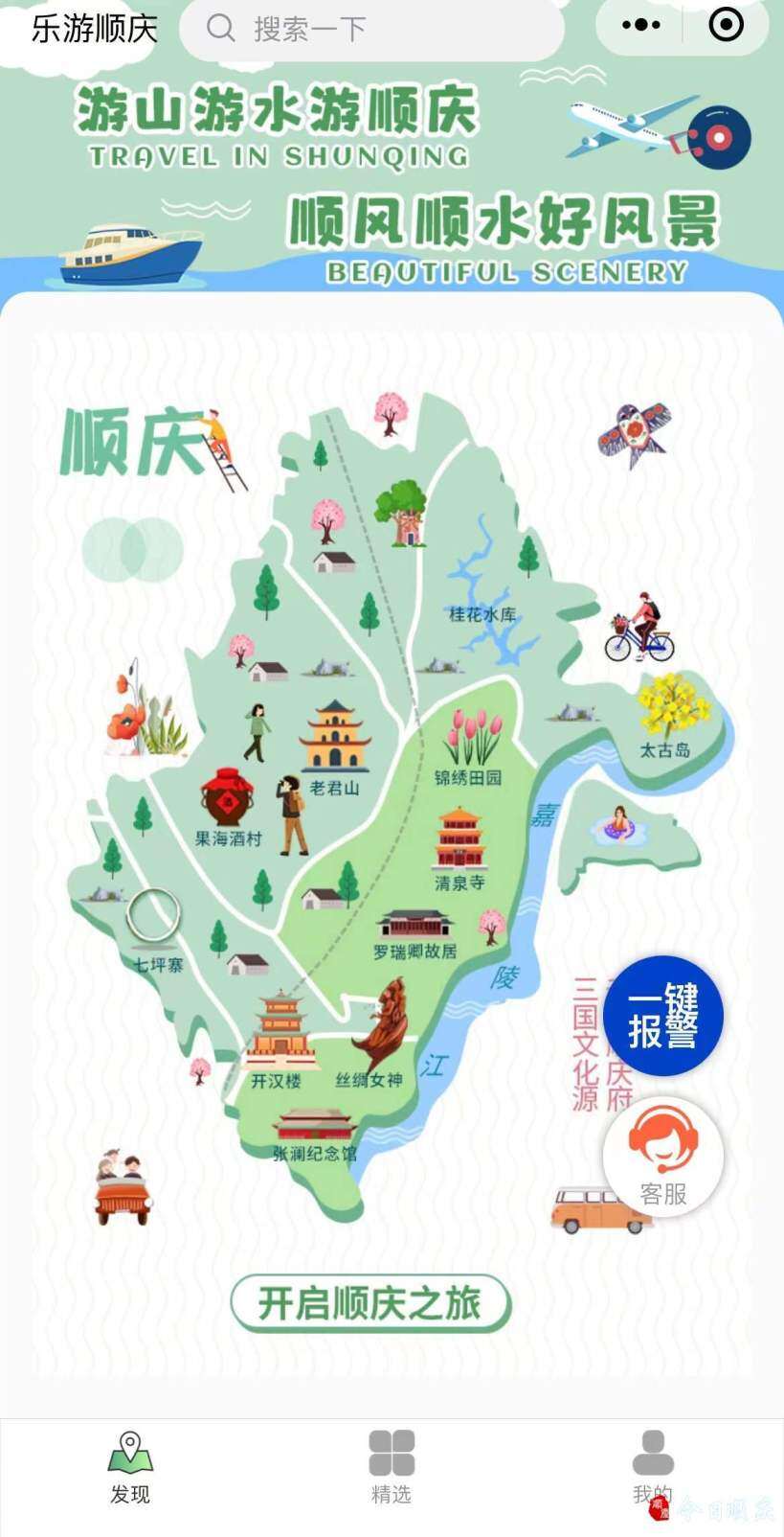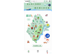 一打开“乐游顺庆”小程序的界面,就马上会被漫画版的顺庆地图所吸引,地图上清楚的标注出了各个景点的位置,用卡通的造型呈现,十分新颖和醒目,而最上方巨大的LOGO“游山游水游顺庆,顺风顺水好风景”既押韵又接地气,一眼看去,整个版面美观又精致,醒目又方便。