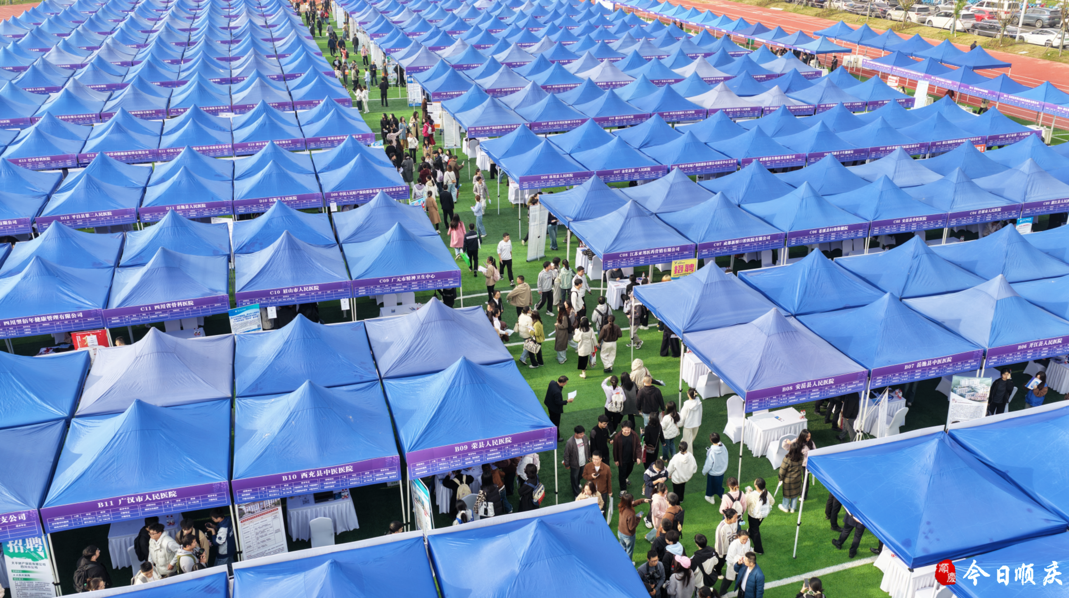 11月4日,2025年四川省秋季医药卫生人才招聘大会暨“蜀汇菁英”四川省高校毕业生就业常设市场医药健康产业专场招聘会、“才聚巴蜀”2025年四川省公共就业服务进校园南充行暨扬帆行动——助力青年就业·川北医学院2026届毕业生秋季专场招聘会在川北医学院临江校区同步举行。