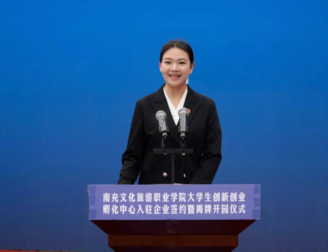 学生代表、经济管理系学生蒋思瑶在发言中承诺,将以双创中心开园为新起点,努力成长为高素质技能人才,为学校“双高”建设和南充文旅产业高质量发展贡献青春力量。