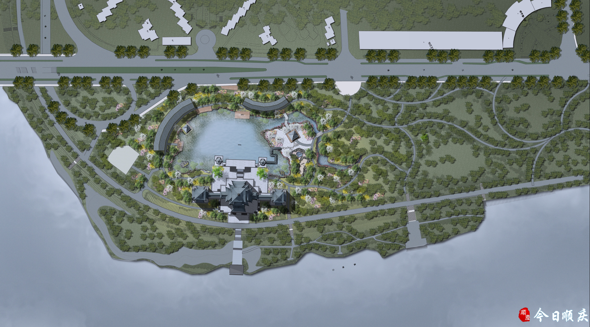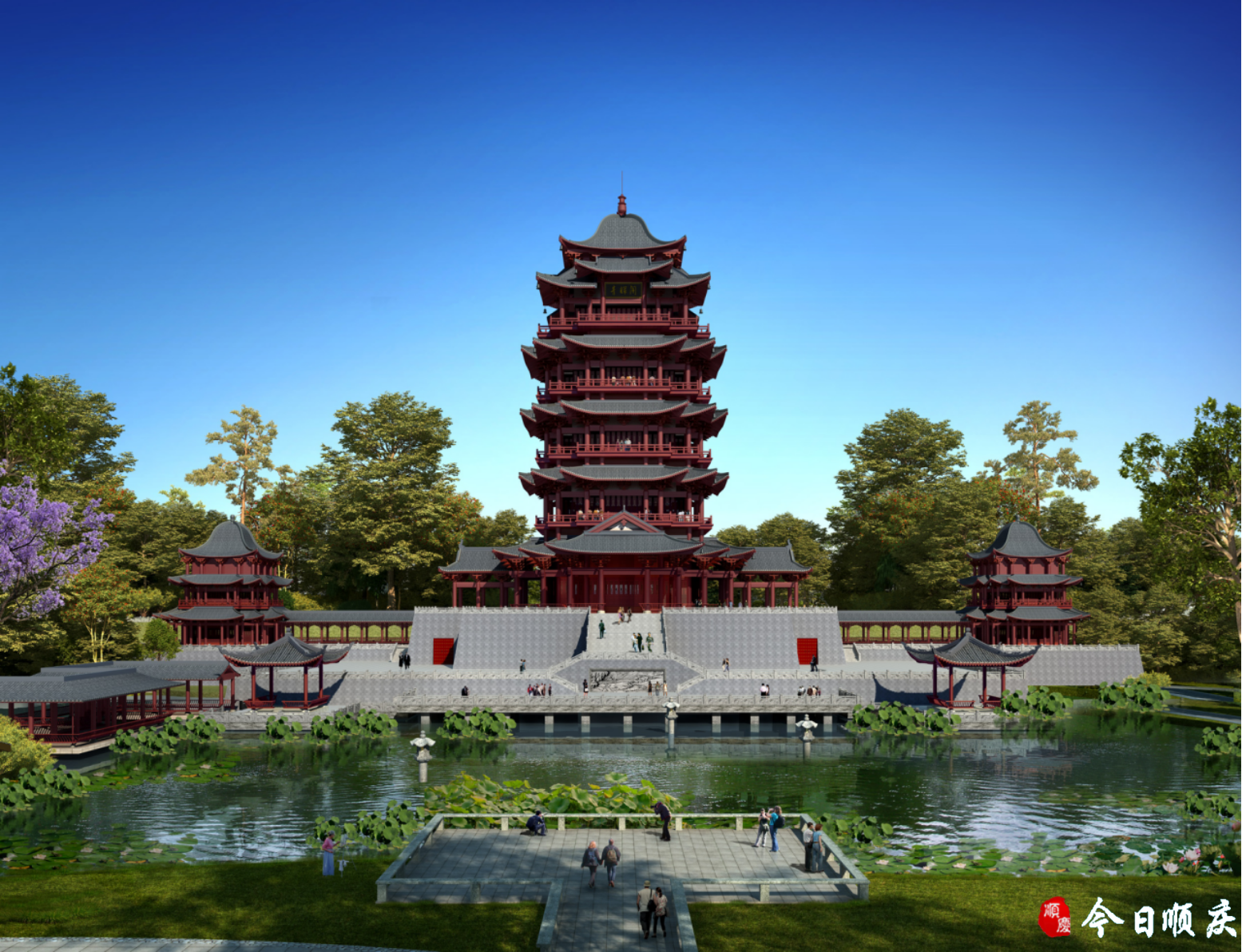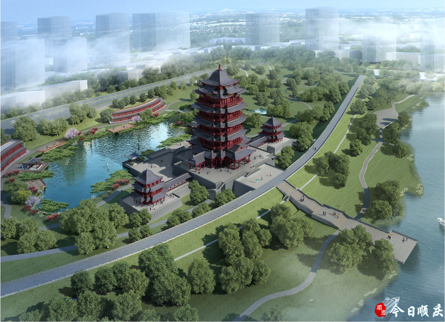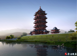 立面选取宋代风格,造型简洁大方,沉稳厚重,充分沿袭宋代楼阁建筑特点,采用朱墙灰瓦,注重平座层外廊设计,细节丰富,点缀城市。建成后,将与南门坝生态公园相对接,形成步行绿环,增加路网密度,完善旅游步行骨架。