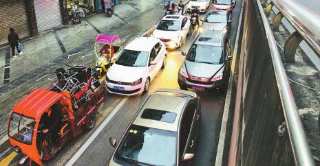 人民北路高架桥附近一家商铺的老板告诉记者,人民北路高架桥这处节点,长期存在拥堵状况。后来,因配合城区道路改造工程, 和平东路又实施了由西向东的单向通行管制措施。这样一来,从金鱼岭方向由北向南行驶的车辆,到达此处无法右转, 不得不上高架桥或沿桥旁的辅道行驶。所以,这里常常是车辆“打挤”。许多摩托车、 电瓶车索性直接开上辅道旁的人行道,也危及了过往行人的人身安全。