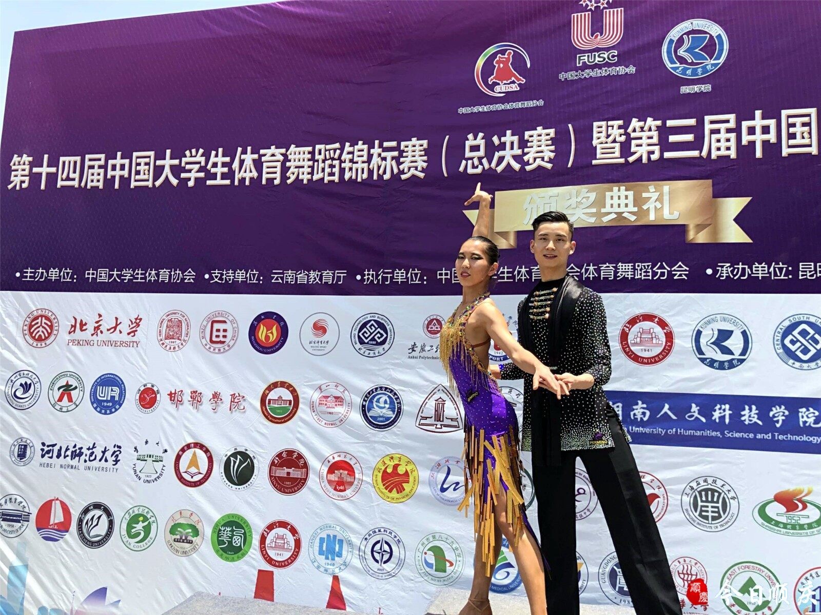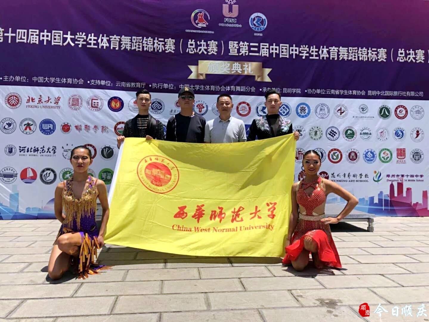 日前,第十四届中国大学生体育舞蹈锦标赛暨第三届中国中学生体育舞蹈锦标赛总决赛在云南昆明学院举行。来自北京大学、中央民族大学、北京体育大学等78所院校的1100余名“舞林高手”齐聚昆明学院,在127个比赛项目上同台竞技。西华师范大学体育学院2017级的四名学生参赛,经过激烈角逐,陈烨彬、鲁威斩获大学生拉丁舞双项第六名,大学生拉丁舞单项第七名;刘治洪、刘雪梅获得大学生拉丁舞单项第八名。