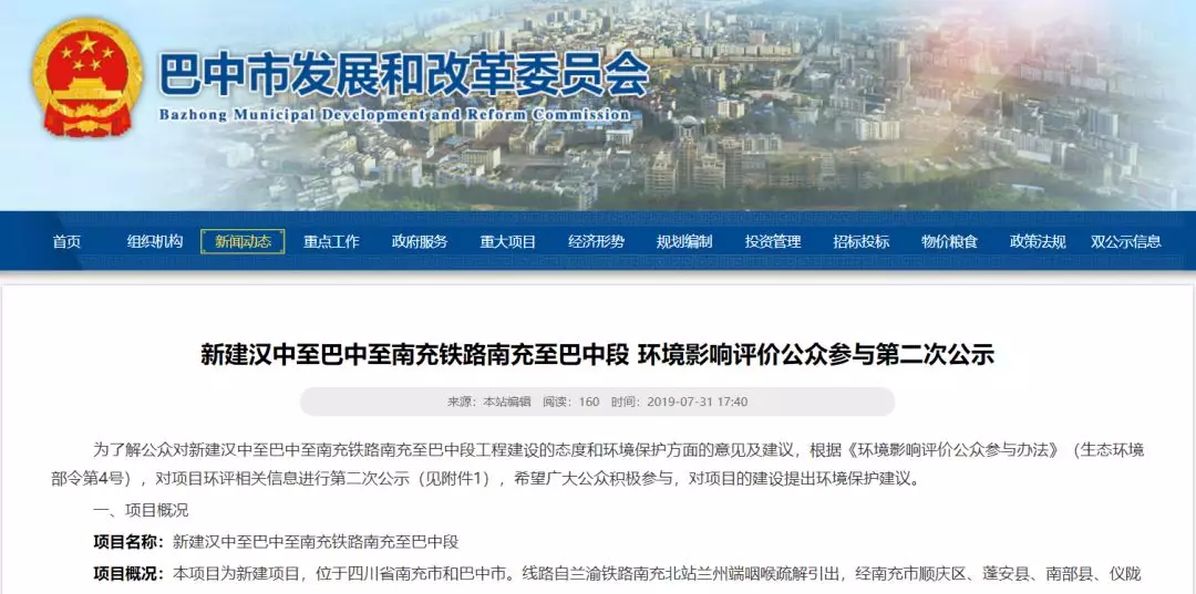 7月31日,巴中市发改委官网发布了一则公示信息《新建汉中至巴中至南充铁路南充至巴中段 环境影响评价公众参与第二次公示》,紧接着,8月1日,南充市发改委官网也发布了本次公示。
