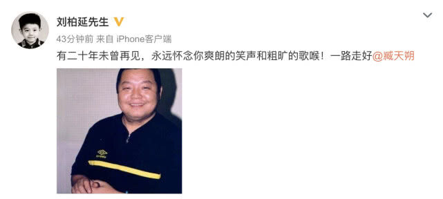 9月28日四点五十六分,著名歌手臧天朔因患肝癌于北京离世,享年54岁。歌手刘柏延发博哀悼:“有二十年未曾再见,永远怀念你爽朗的笑声和粗旷的歌喉,一路走好!”得知臧天朔去世的消息,多位圈内人发文悼念。